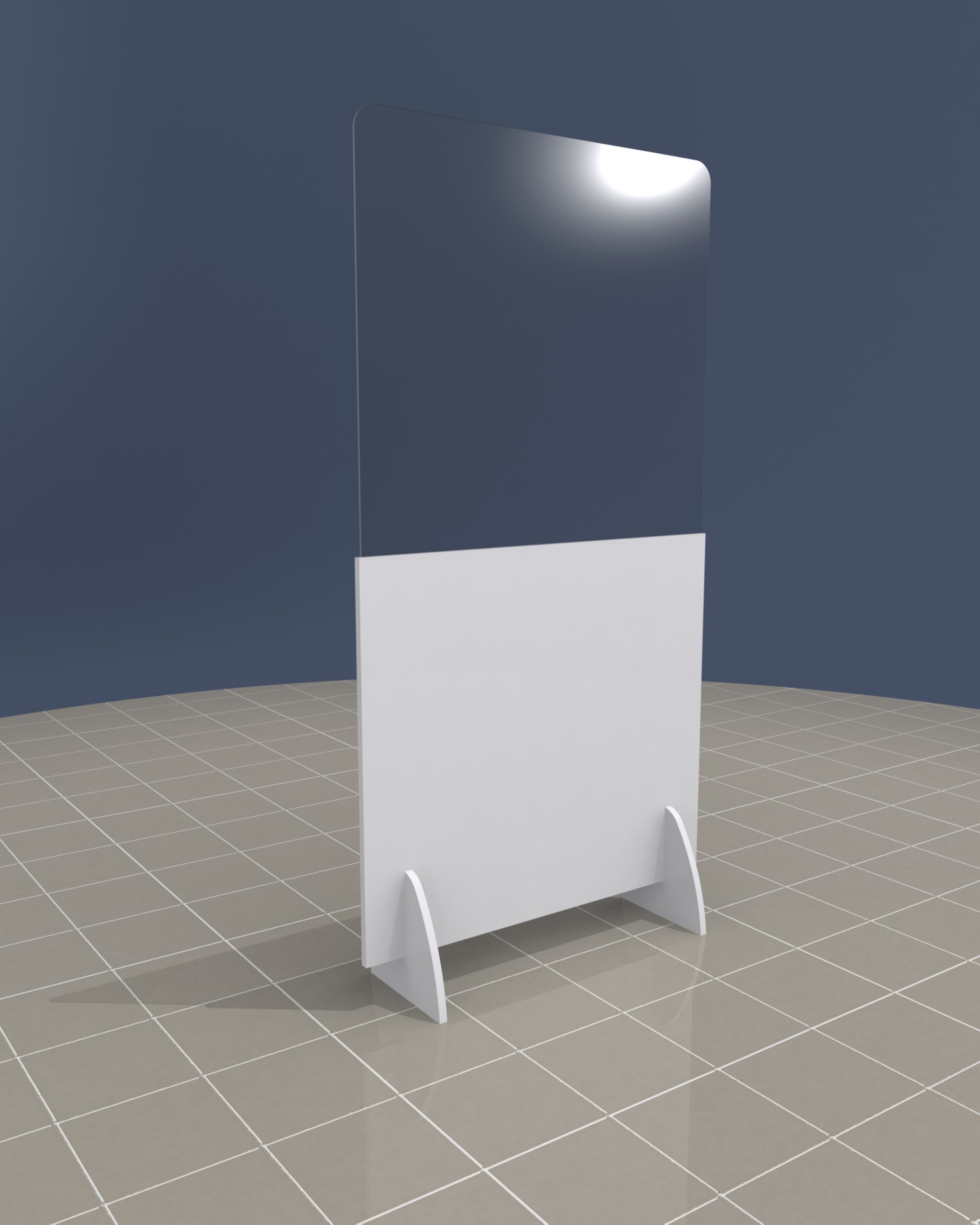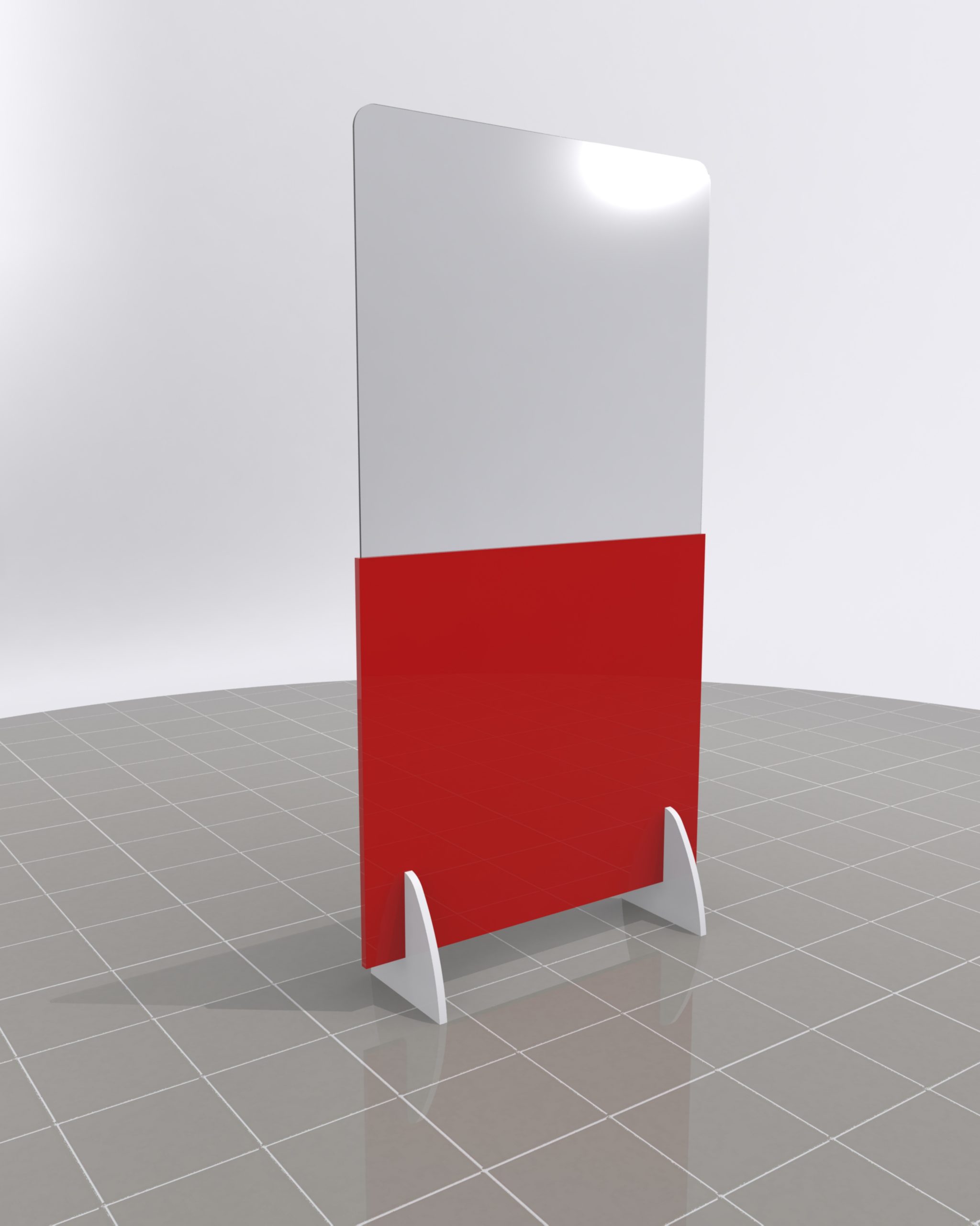 Mampara de protección anticontagios tipo biombo con posibilidad de personalizar el cuerpo inferior, colores, anuncios, logotipos, etc. Color cuerpo inferior de serie Blanco.