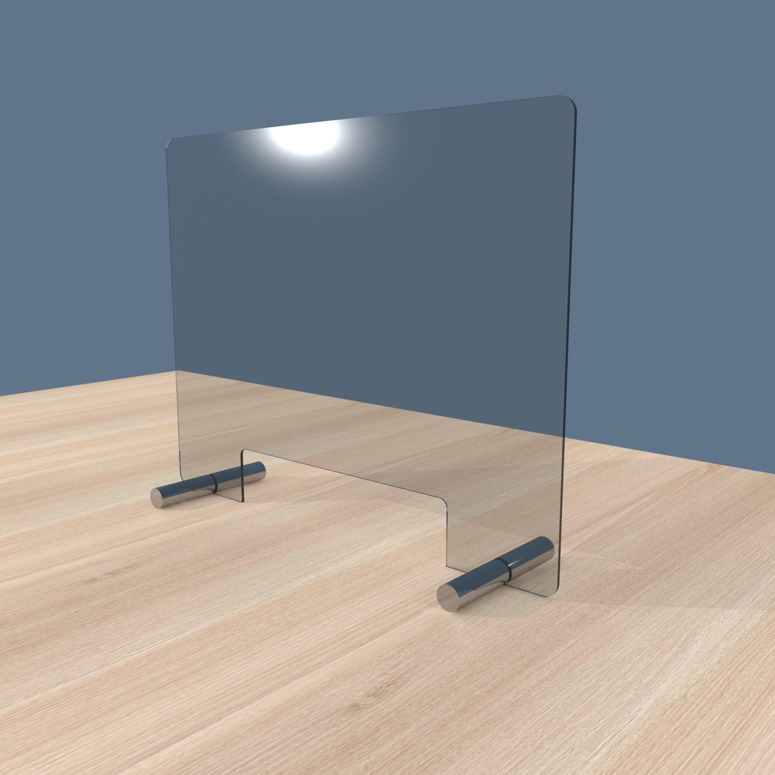 Mampara de protección anticontagio, fabricada en vidrio templado EXTRACLARO de 5 mm de espesor, con todas las esquinas redondeadas. Con bases cilindricas de acero inoxidable satinado largo 150 mm Ø25 mm. Con posibilidad de incluir una brida para el anclaje de la base.